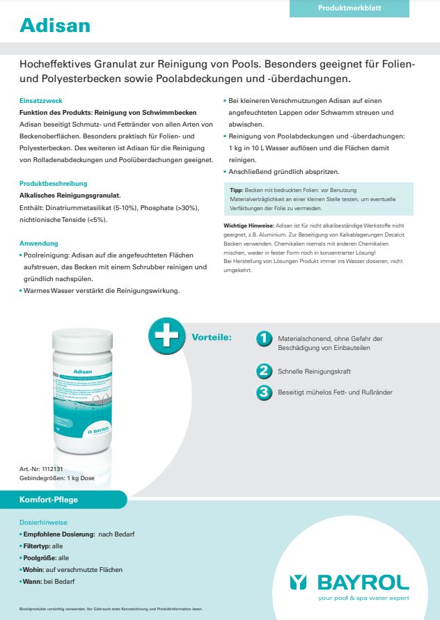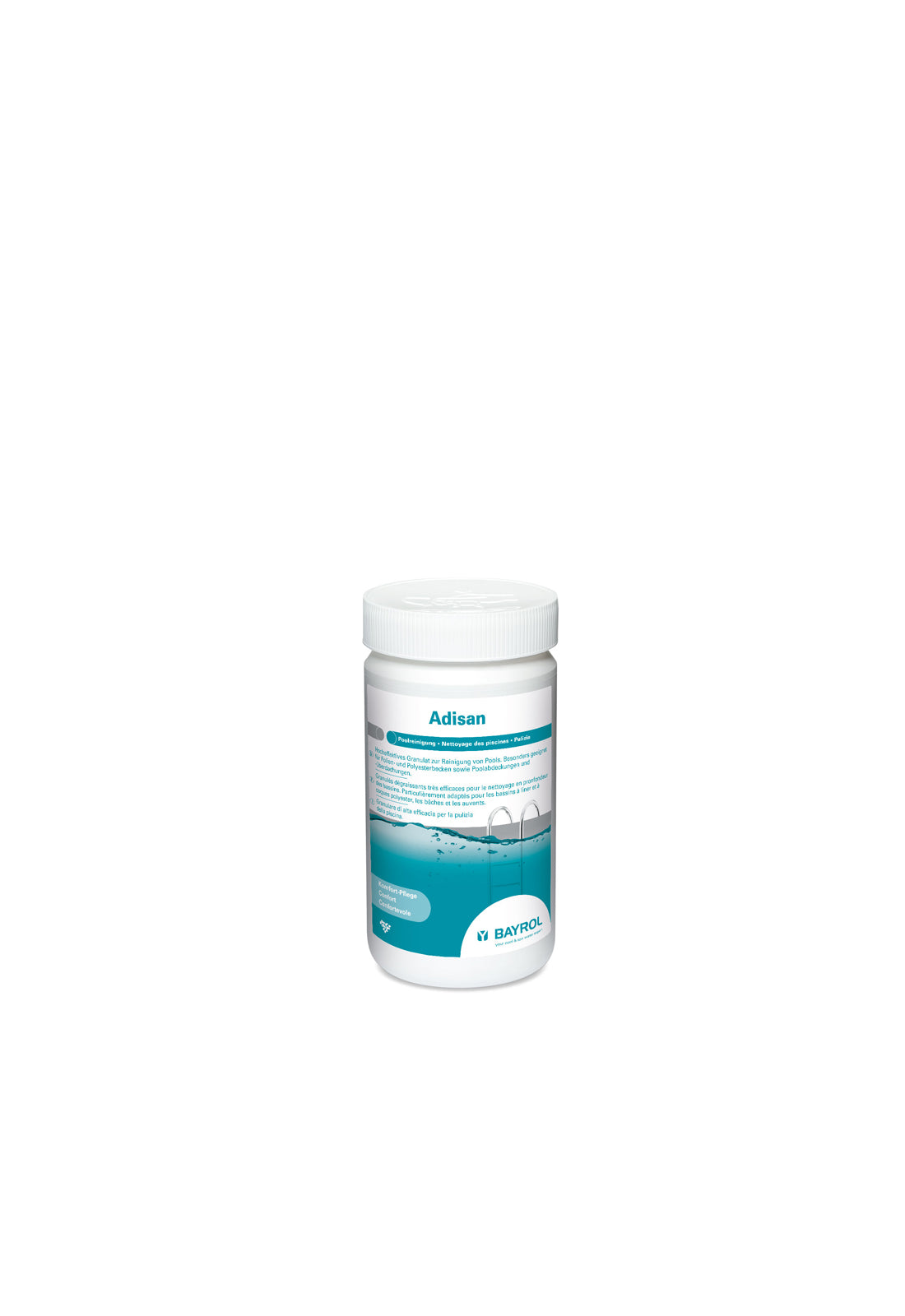 Der Poolreiniger Adisan beseitigt Schmutz- und Fettränder von allen Arten von Beckenoberflächen. Besonders praktisch für Folien- und Polyesterbecken.