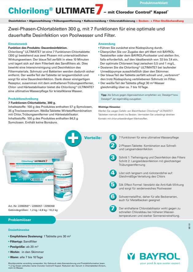 Chlorilong®  ULTIMATE7 ist eine zwei-Phasen-Chlortablette à 300 g mit 7 Funktionen für eine optimale und dauerhafte von Poolwasser und Filter.