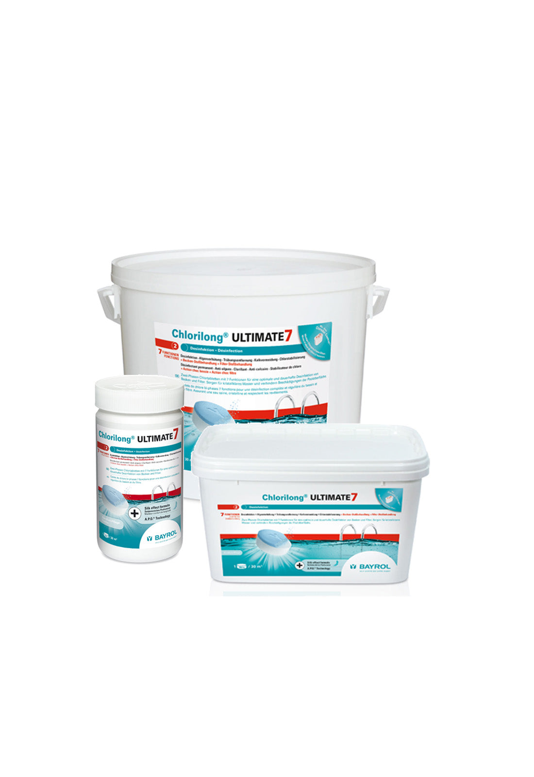 Chlorilong® ULTIMATE7 besteht aus zwei Phasen mit 7 Funktionen: Desinfektion, Algenverhütung, Trübungsentfernung, Kalkvermeidung, Chlorstabilisierung, Poolwasser-Stoßbehandlung und Filter-Stoßbehandlung.