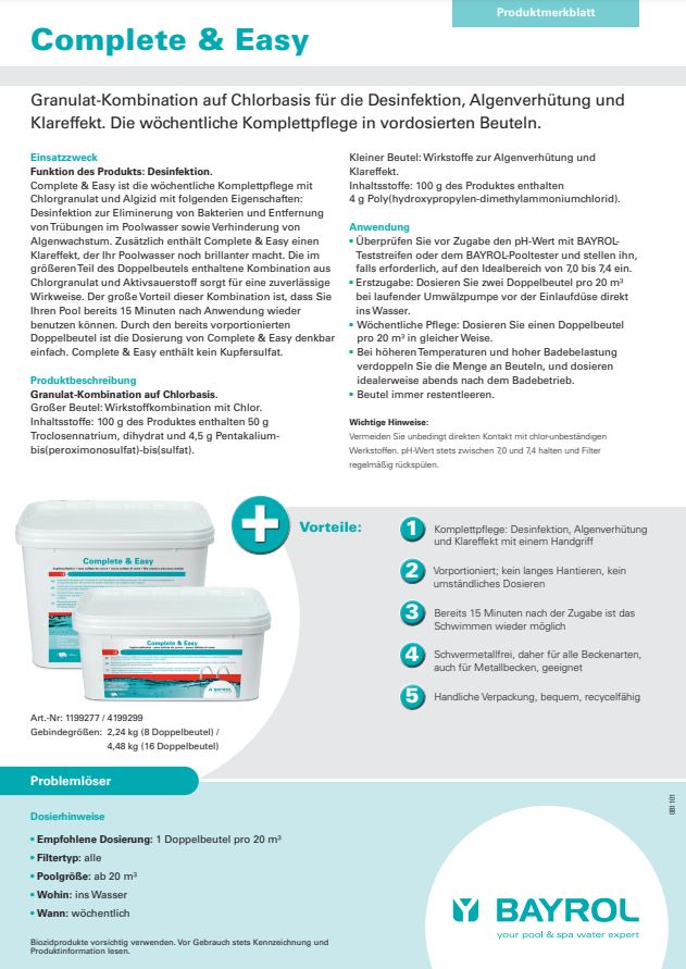 Complete & Easy ist die einfache wöchentliche Komplettpflege in vordosierten Beuteln. Das enthaltene Chlorgranulat und Algizid desinfizieren das Poolwasser und verhindern Algenwachstum.