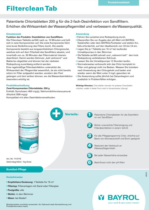 Filterclean Tab ist ein starkes Desinfektionsmittel für Filteranlagen mit Sand oder Glas. Die patentierte Chlortablette zerfällt nach ca. 10 Minuten und entfernt Verunreinigungen die sich trotz Rückspülung im Filterbett des Sandfilters abgesetzt haben.