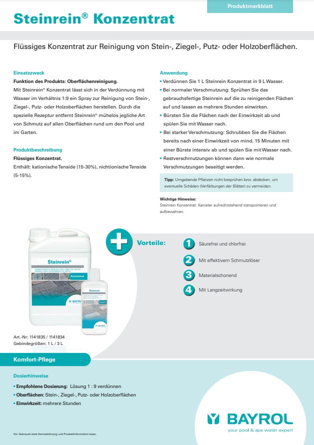 Flüssiges Konzentrat zur Reinigung von Stein-, Ziegel-, Putz- oder Holzoberflächen rund um den Pool und im Garten.
