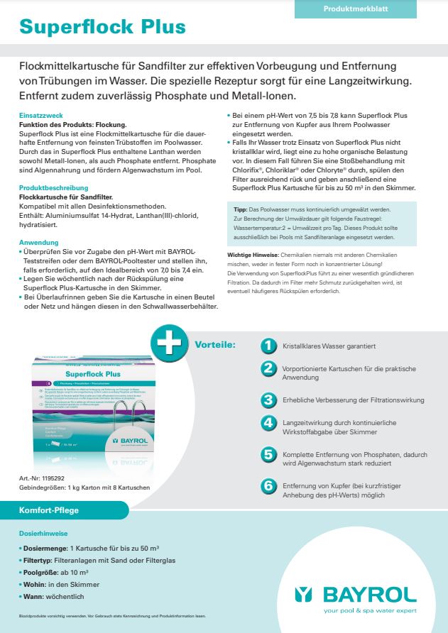 Mit Superflock Plus wird das Poolwasser schnell wieder klar. Die spezielle Formel und das im Superflock Plus enthaltene Lanthan entfernen zuverlässig Metall-Ionen (eisenhaltiges Brunnenwasser) und Phosphate (Algennahrung), die für die Vermehrung von Algen verantwortlich sind.