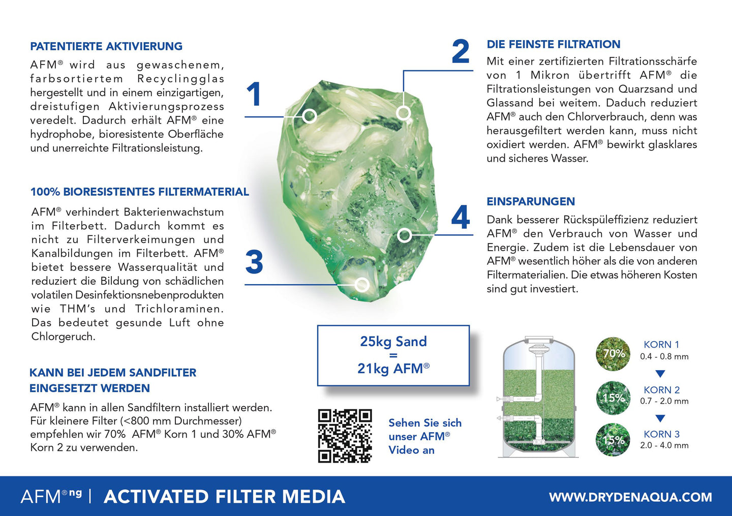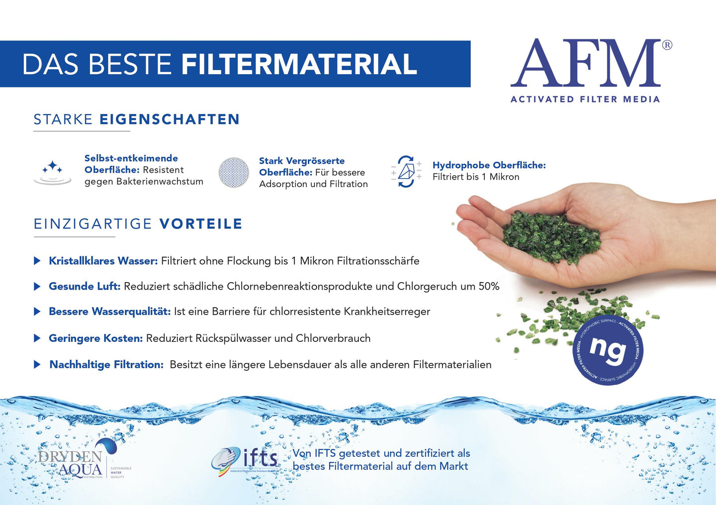 AFM® Aktiviertes Filtermaterial bietet eine effektive Alternative zu traditionellem Filtersand und steigert die Effizienz von Sandfilteranlagen ohne die Notwendigkeit für zusätzliche Investitionen in die bestehende Infrastruktur.