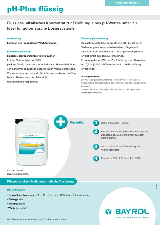 pH-Plus flüssig ist ein alkalisches Konzentrat zur kontinuierlichen pH-Wert- Anhebung im Schwimmbadwasser.